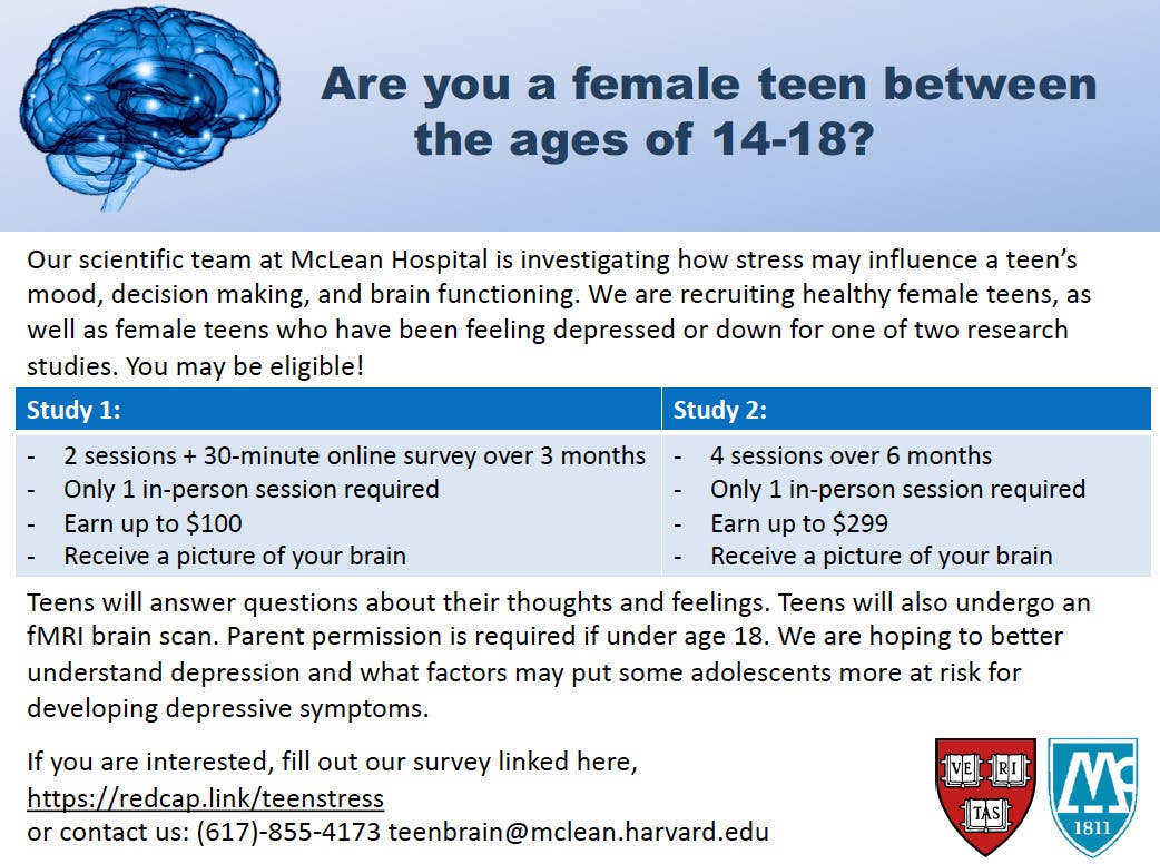 Mclean hospital study on stress and the teen brain! earn up to $299!