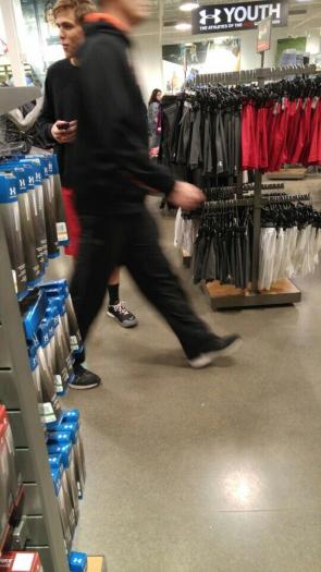 Aisles wide, some merchandise up high, 1 accessible fitting room, music