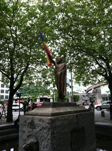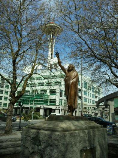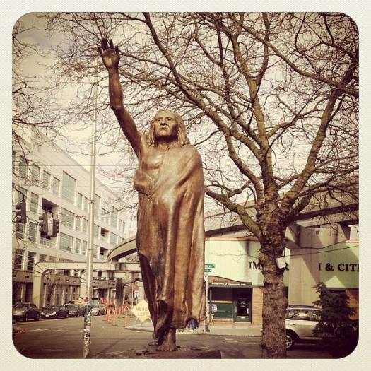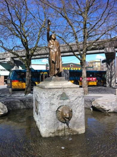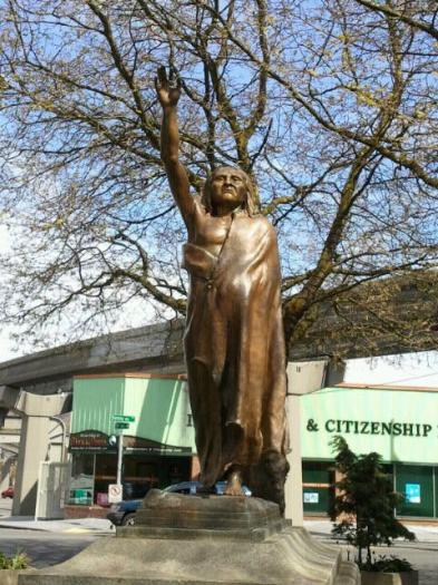 Based on the only known photo of Chief Seattle – the statue is posed looking out toward Puget Sound, his arm raised in greeting. On a granite base are two bronze bear heads that serve as waterspouts and two bronze plaques depicting historical events of