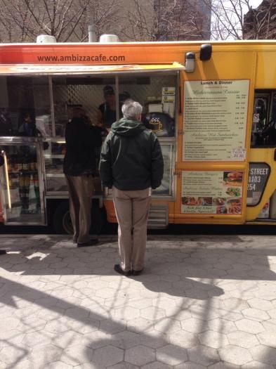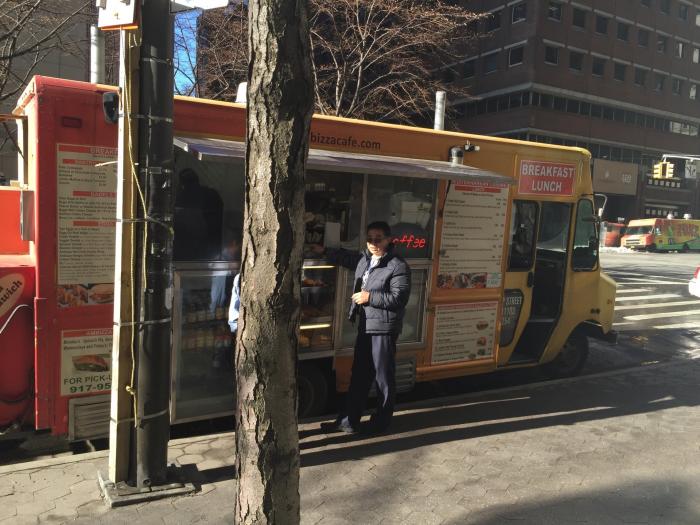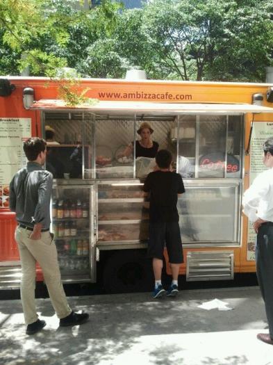 The Ambizza Cafe food truck is parked around here Monday through Friday for lunch (as far as I know), usually on Old Slip or Hanover Square near Water Street.