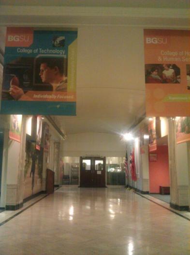The BGSU office of admissions is located here. Although it appears there are only two stories on the outside, there are actually three on the inside.